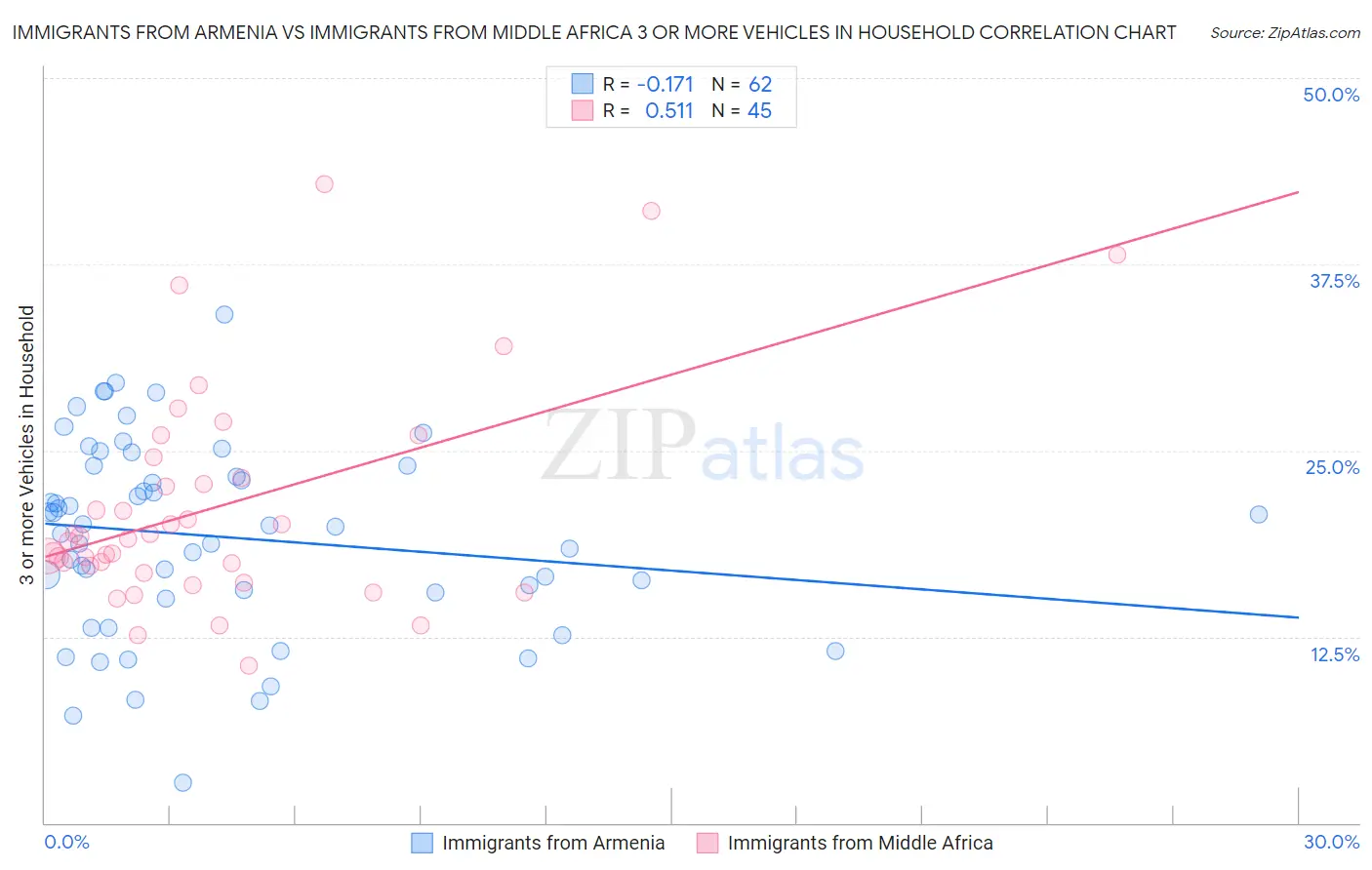 Immigrants from Armenia vs Immigrants from Middle Africa 3 or more Vehicles in Household Correlation Chart