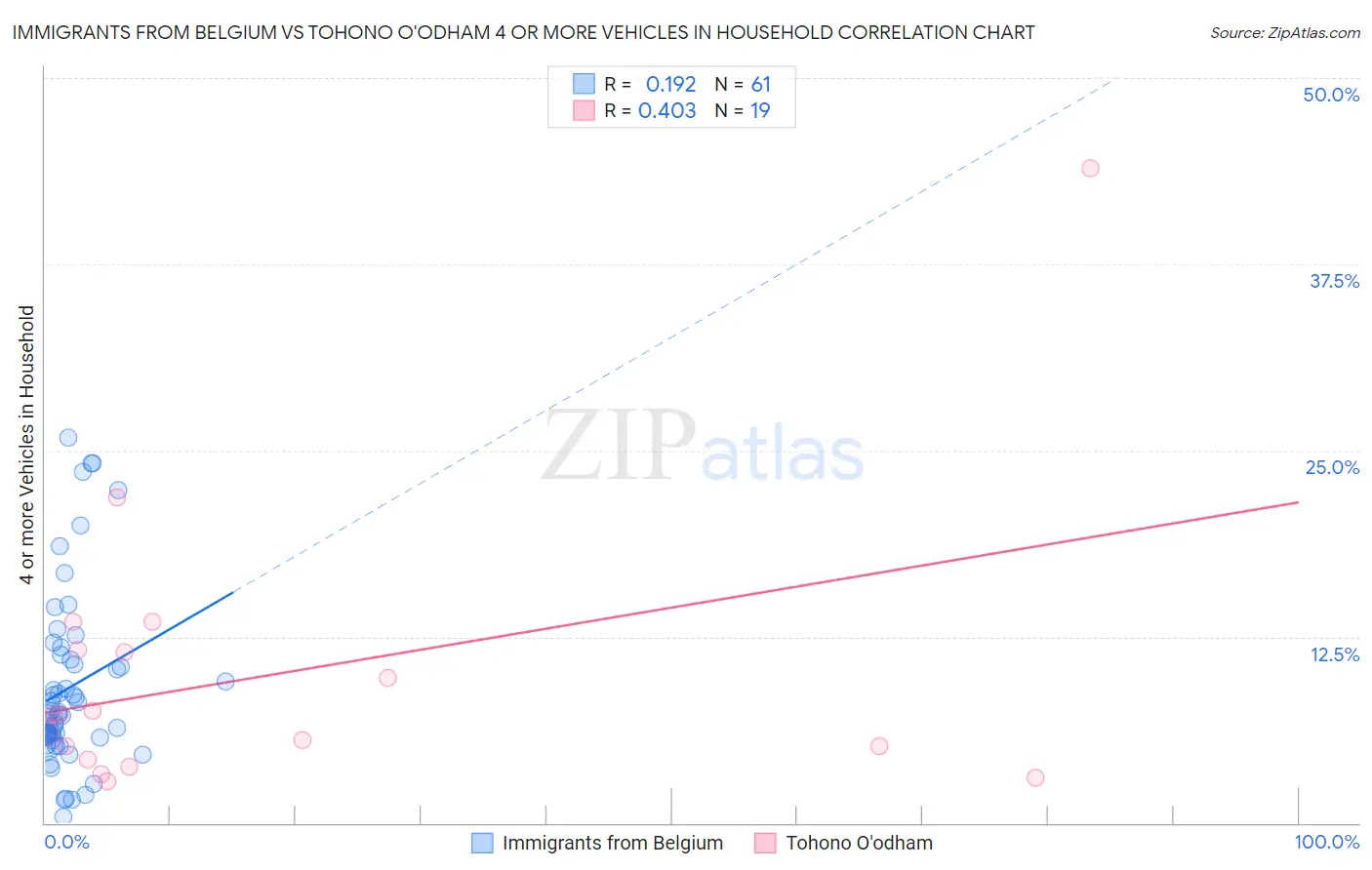 Immigrants from Belgium vs Tohono O'odham 4 or more Vehicles in Household Correlation Chart