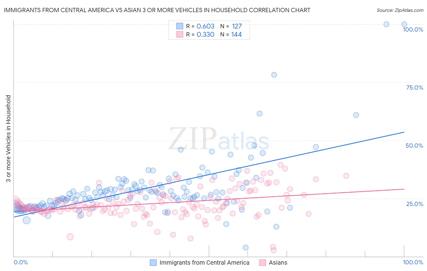 Immigrants from Central America vs Asian 3 or more Vehicles in Household Correlation Chart