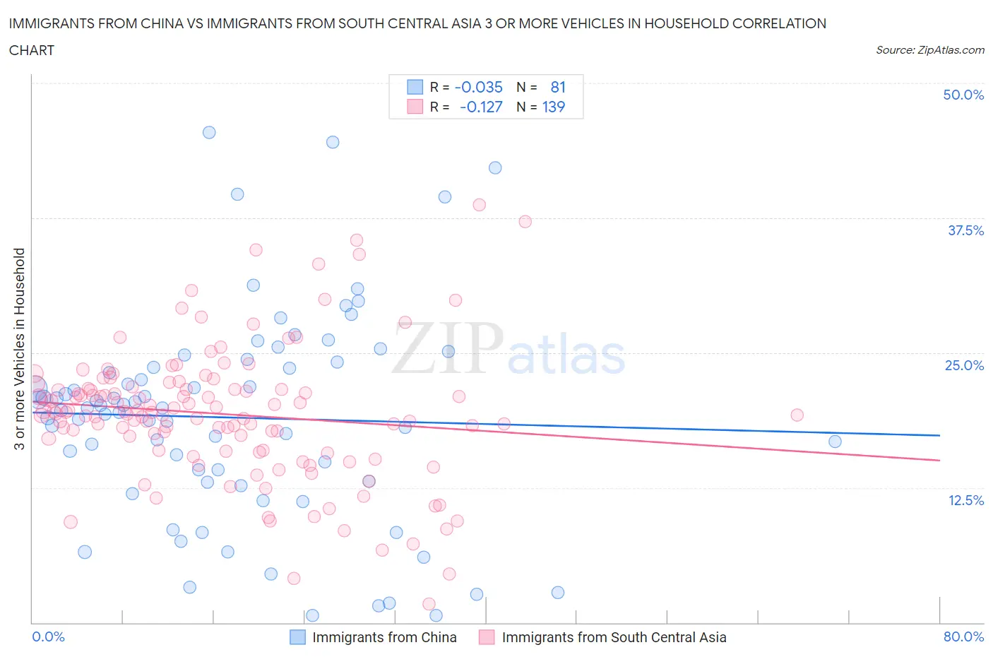 Immigrants from China vs Immigrants from South Central Asia 3 or more Vehicles in Household Correlation Chart
