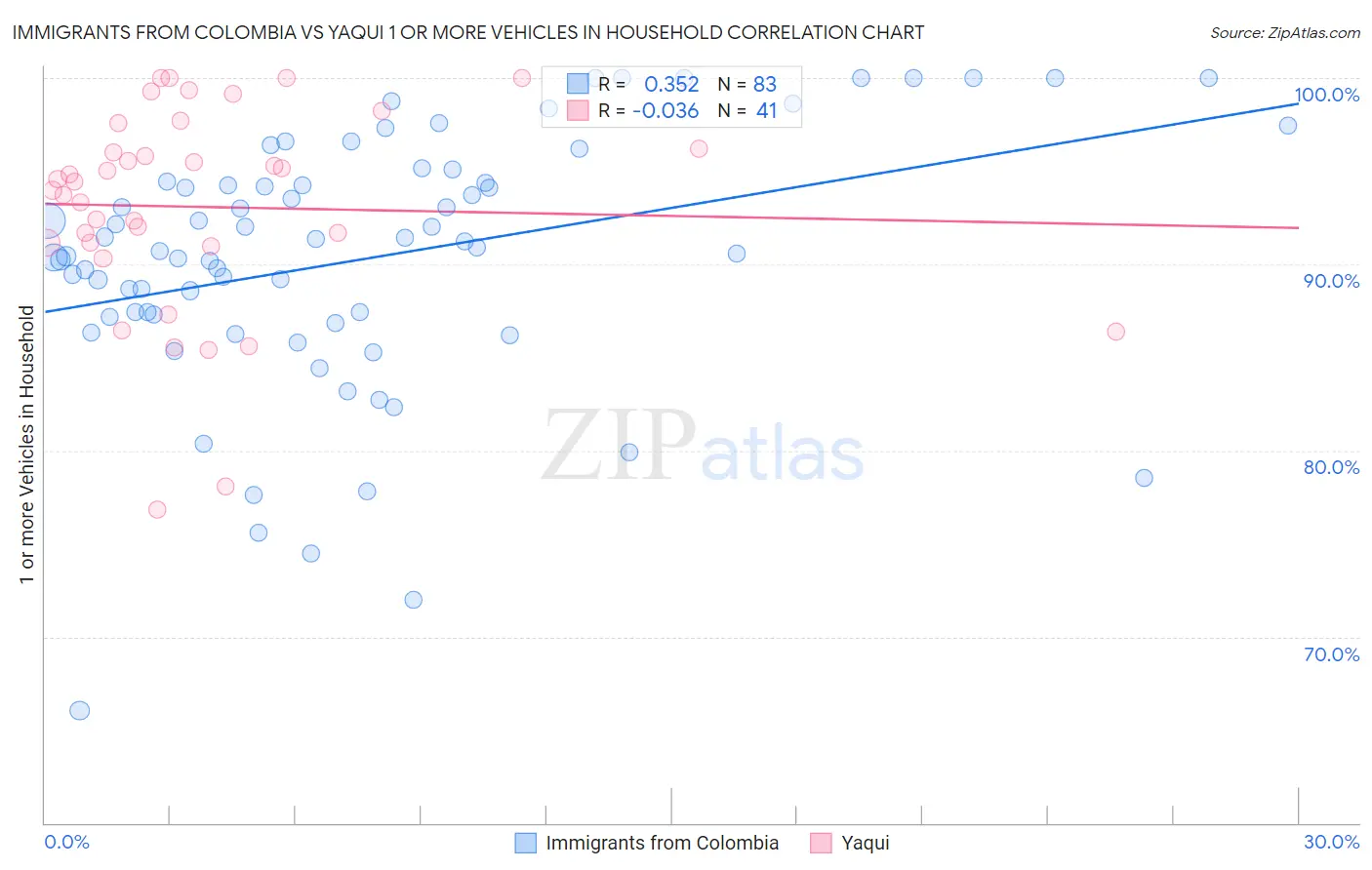 Immigrants from Colombia vs Yaqui 1 or more Vehicles in Household Correlation Chart