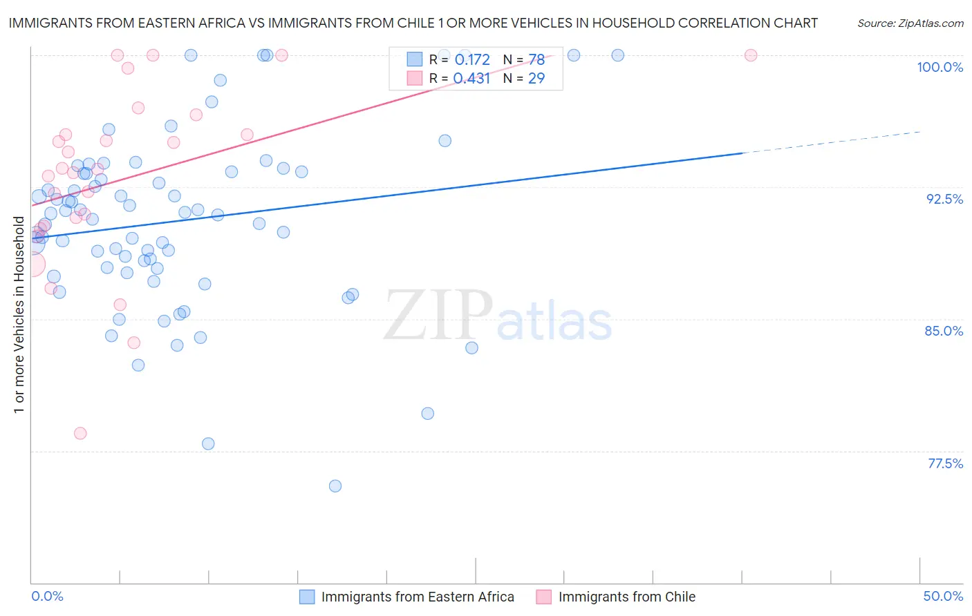 Immigrants from Eastern Africa vs Immigrants from Chile 1 or more Vehicles in Household Correlation Chart
