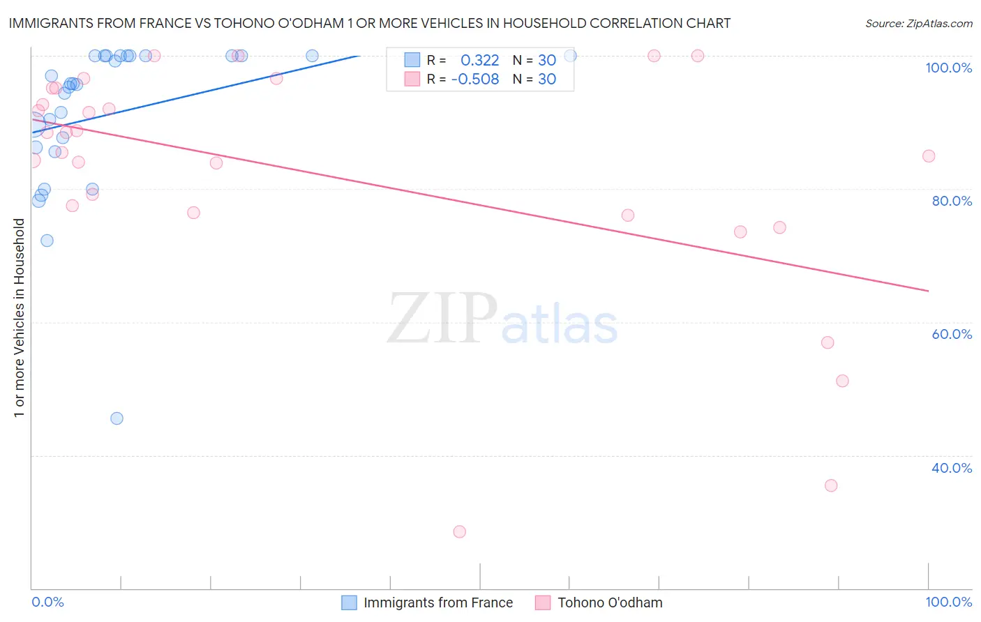 Immigrants from France vs Tohono O'odham 1 or more Vehicles in Household Correlation Chart
