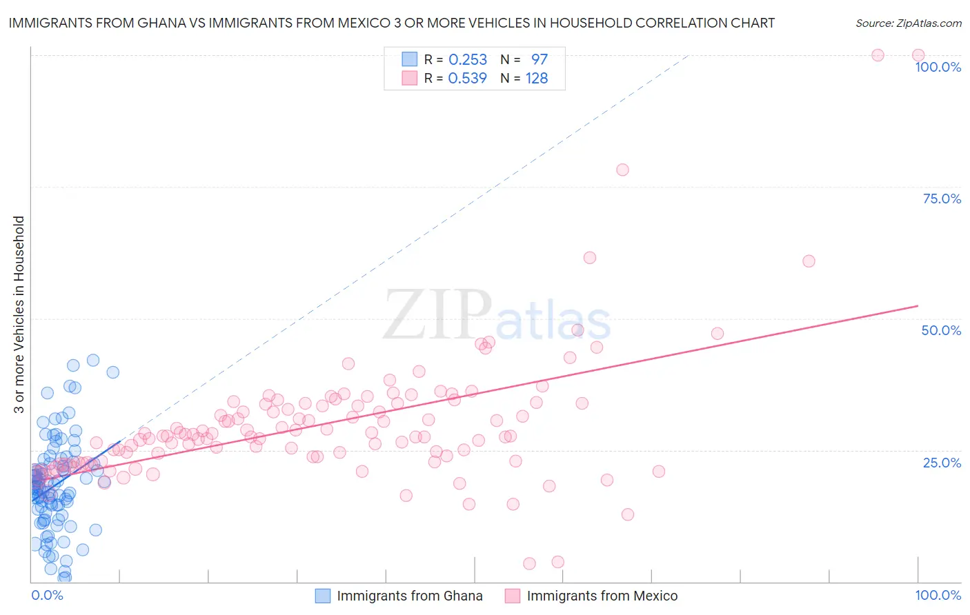 Immigrants from Ghana vs Immigrants from Mexico 3 or more Vehicles in Household Correlation Chart
