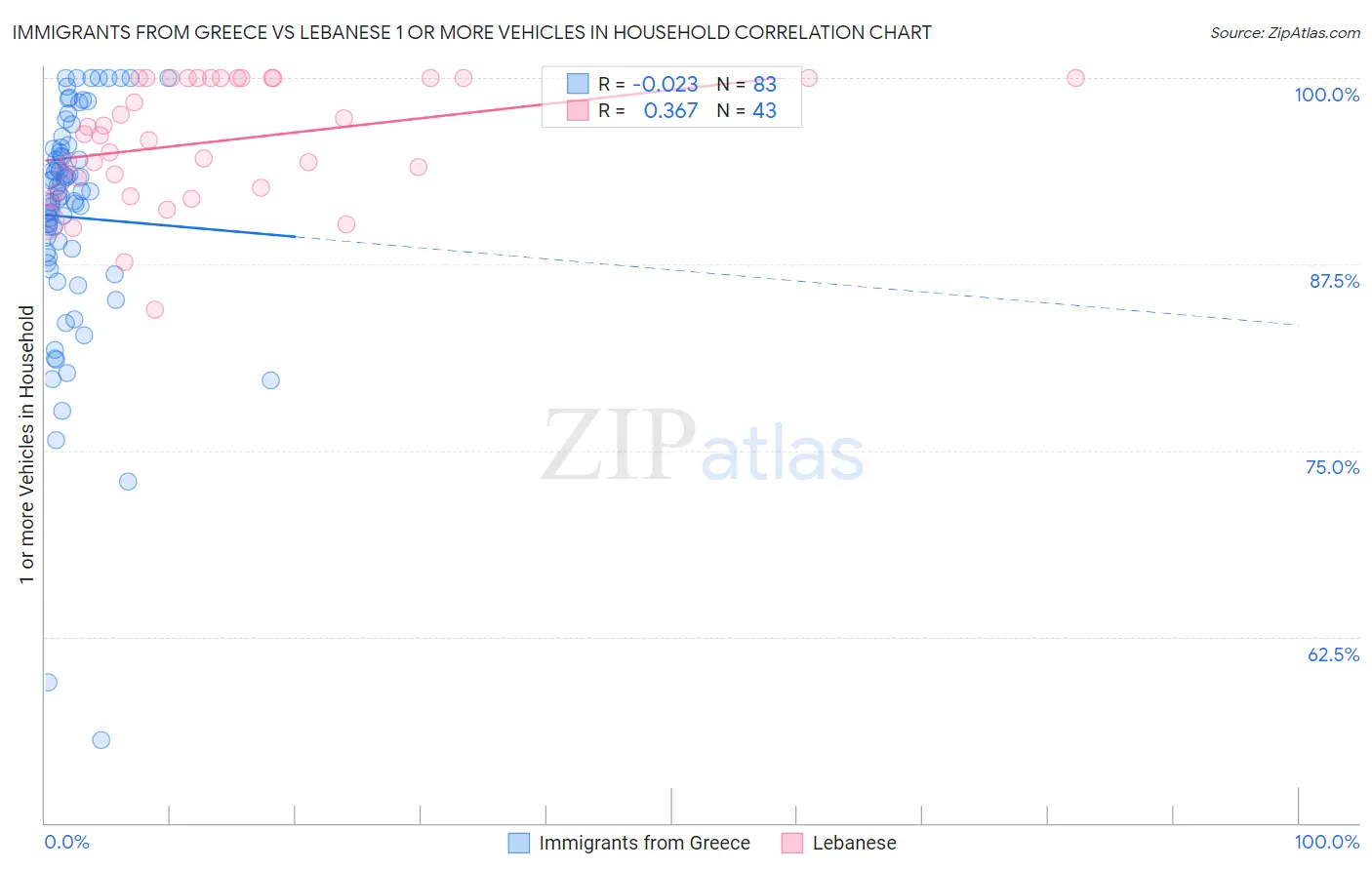 Immigrants from Greece vs Lebanese 1 or more Vehicles in Household Correlation Chart