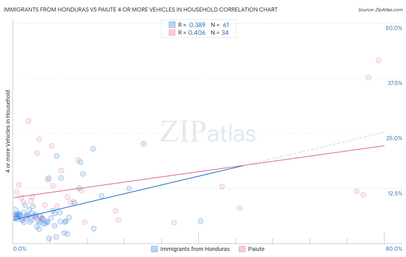 Immigrants from Honduras vs Paiute 4 or more Vehicles in Household Correlation Chart