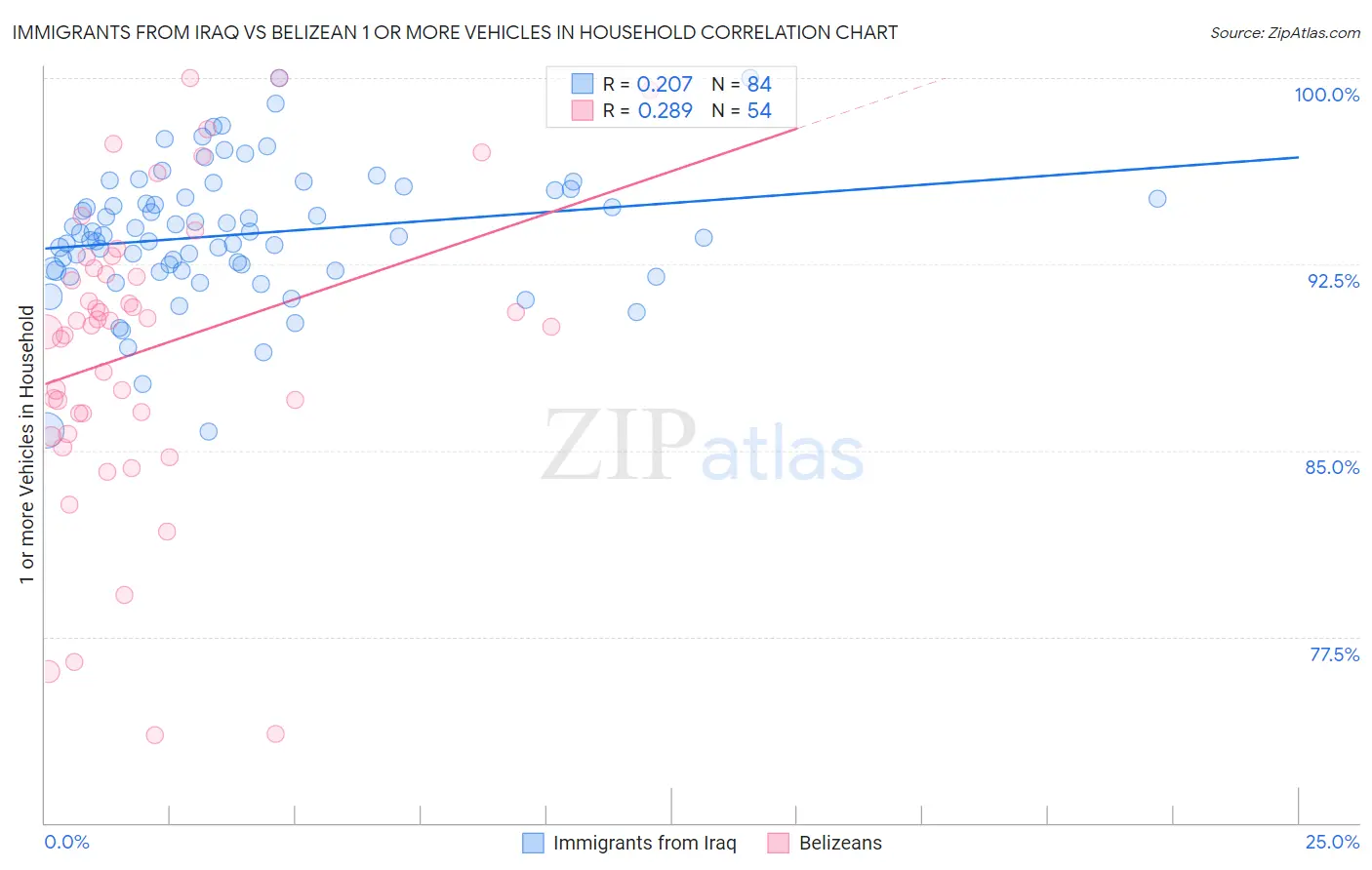 Immigrants from Iraq vs Belizean 1 or more Vehicles in Household Correlation Chart