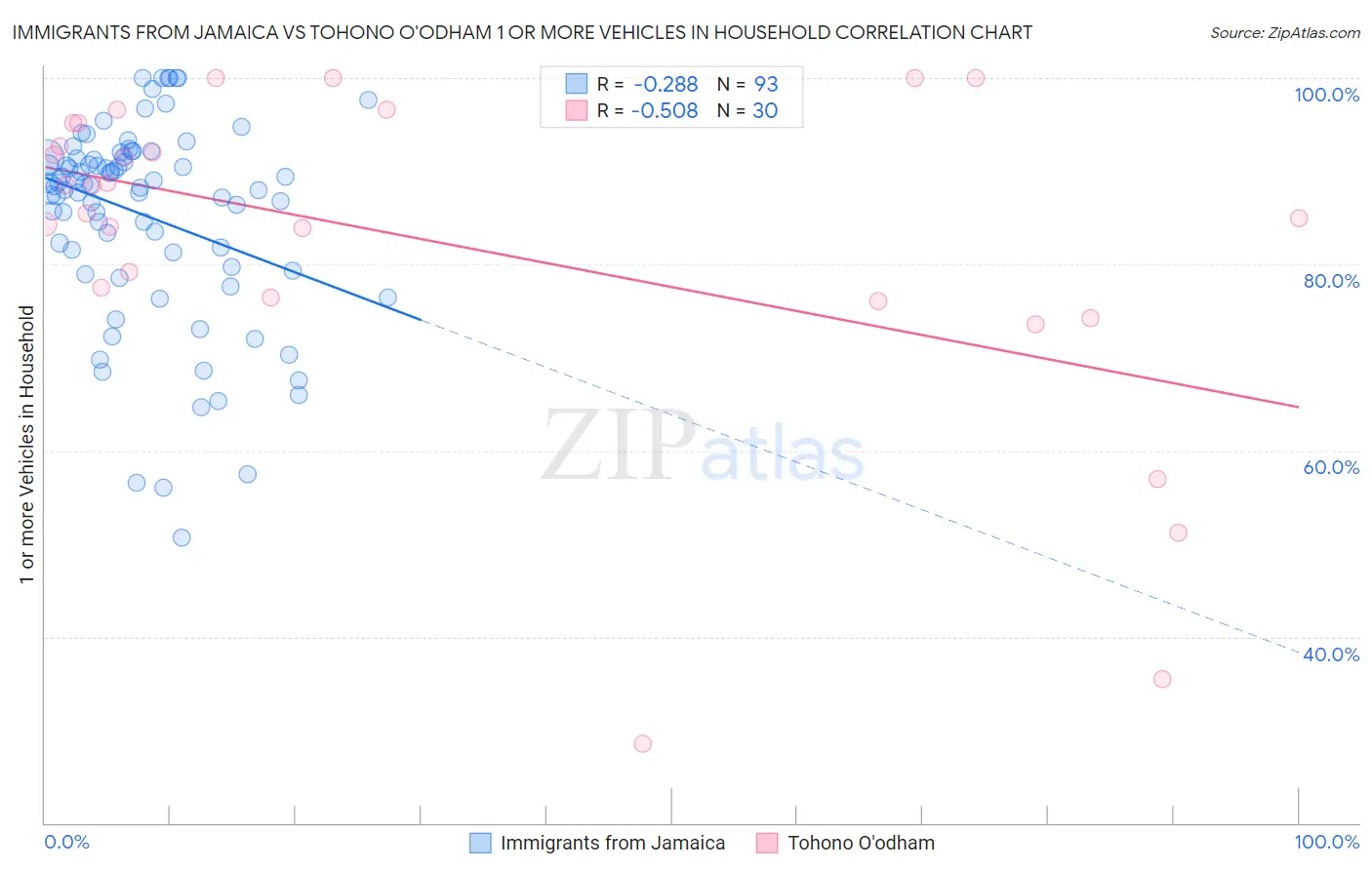 Immigrants from Jamaica vs Tohono O'odham 1 or more Vehicles in Household Correlation Chart