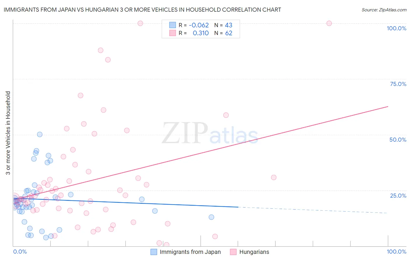 Immigrants from Japan vs Hungarian 3 or more Vehicles in Household Correlation Chart