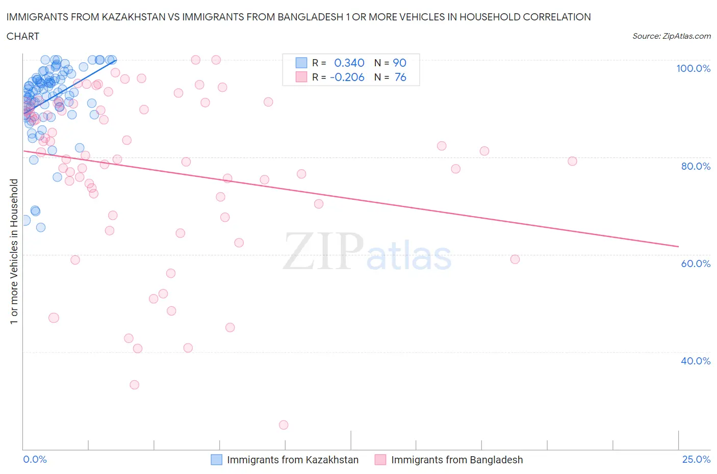 Immigrants from Kazakhstan vs Immigrants from Bangladesh 1 or more Vehicles in Household Correlation Chart