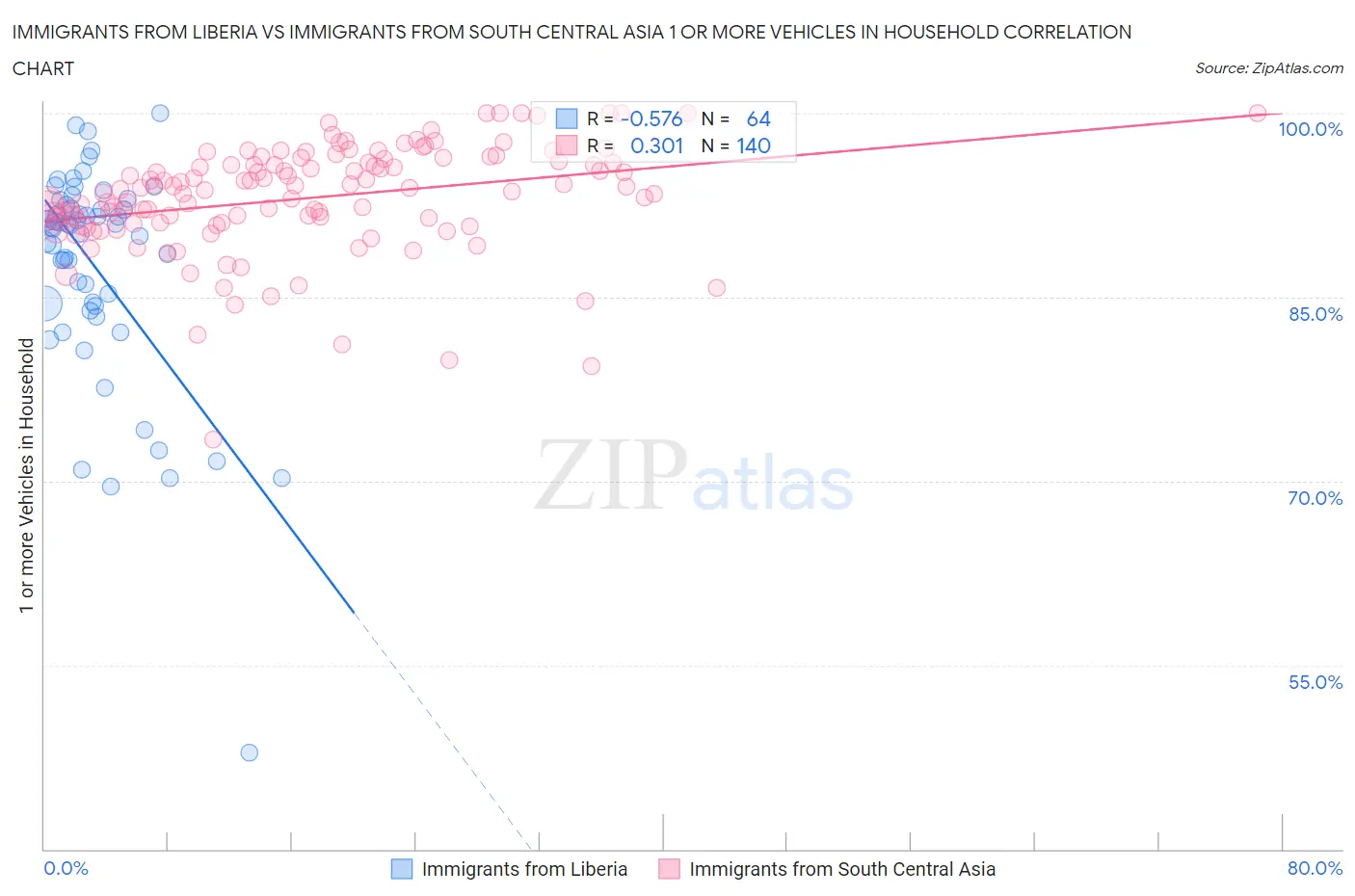 Immigrants from Liberia vs Immigrants from South Central Asia 1 or more Vehicles in Household Correlation Chart