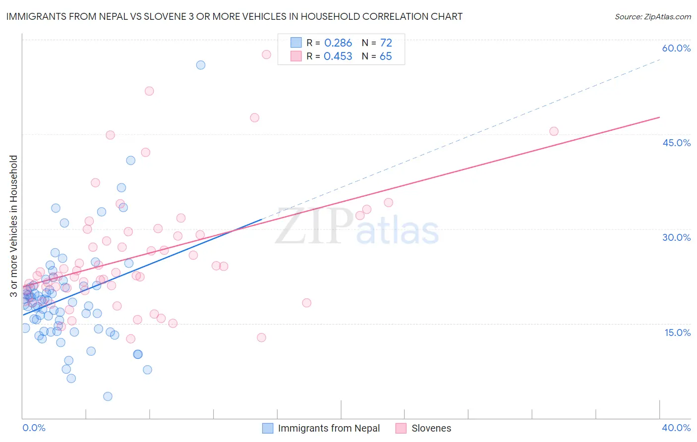 Immigrants from Nepal vs Slovene 3 or more Vehicles in Household Correlation Chart