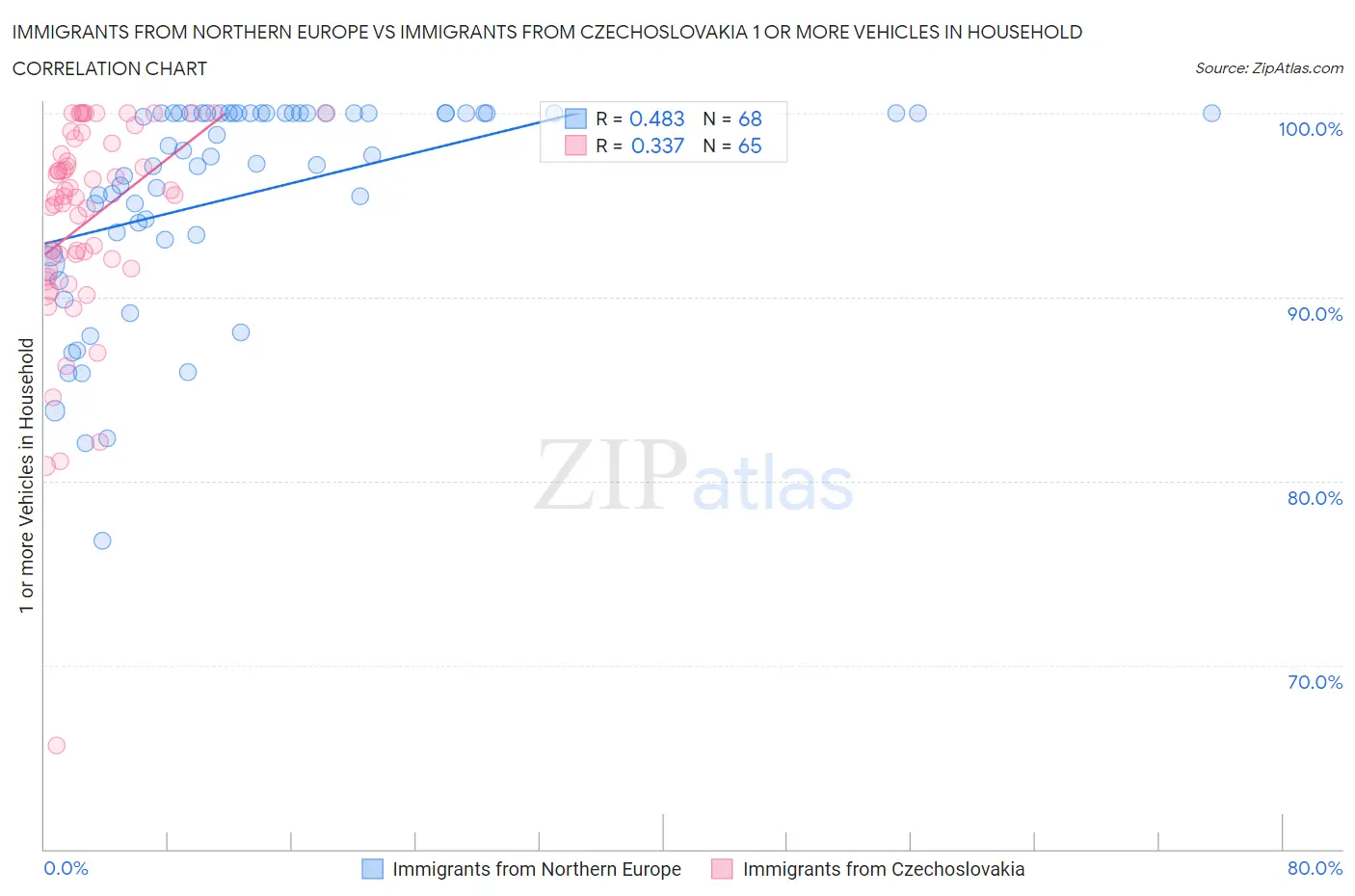 Immigrants from Northern Europe vs Immigrants from Czechoslovakia 1 or more Vehicles in Household Correlation Chart