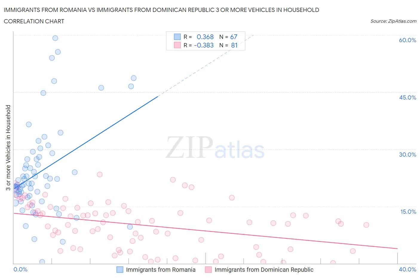 Immigrants from Romania vs Immigrants from Dominican Republic 3 or more Vehicles in Household Correlation Chart