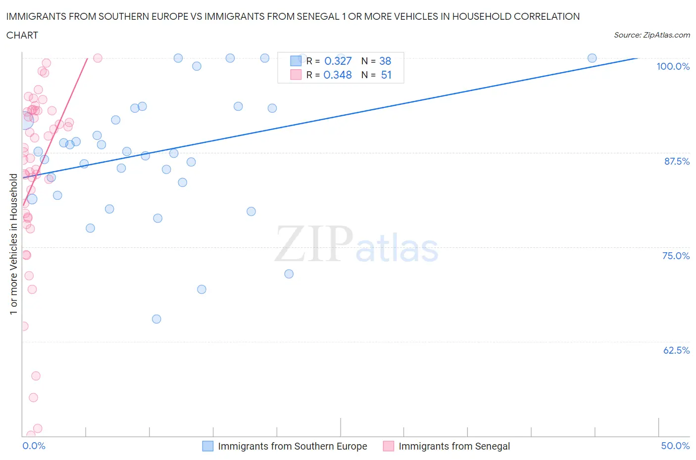 Immigrants from Southern Europe vs Immigrants from Senegal 1 or more Vehicles in Household Correlation Chart