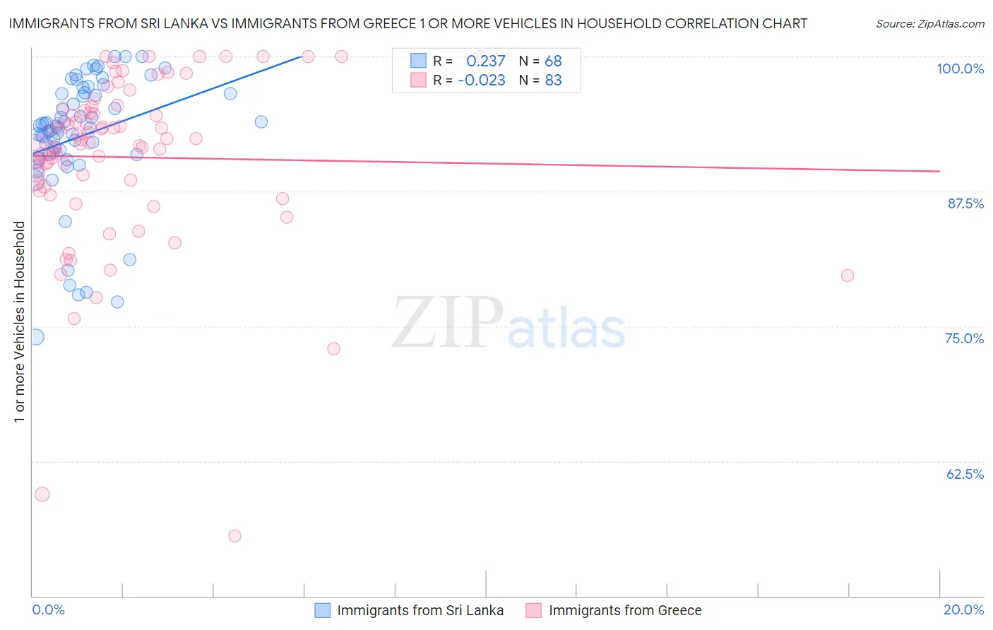Immigrants from Sri Lanka vs Immigrants from Greece 1 or more Vehicles in Household Correlation Chart