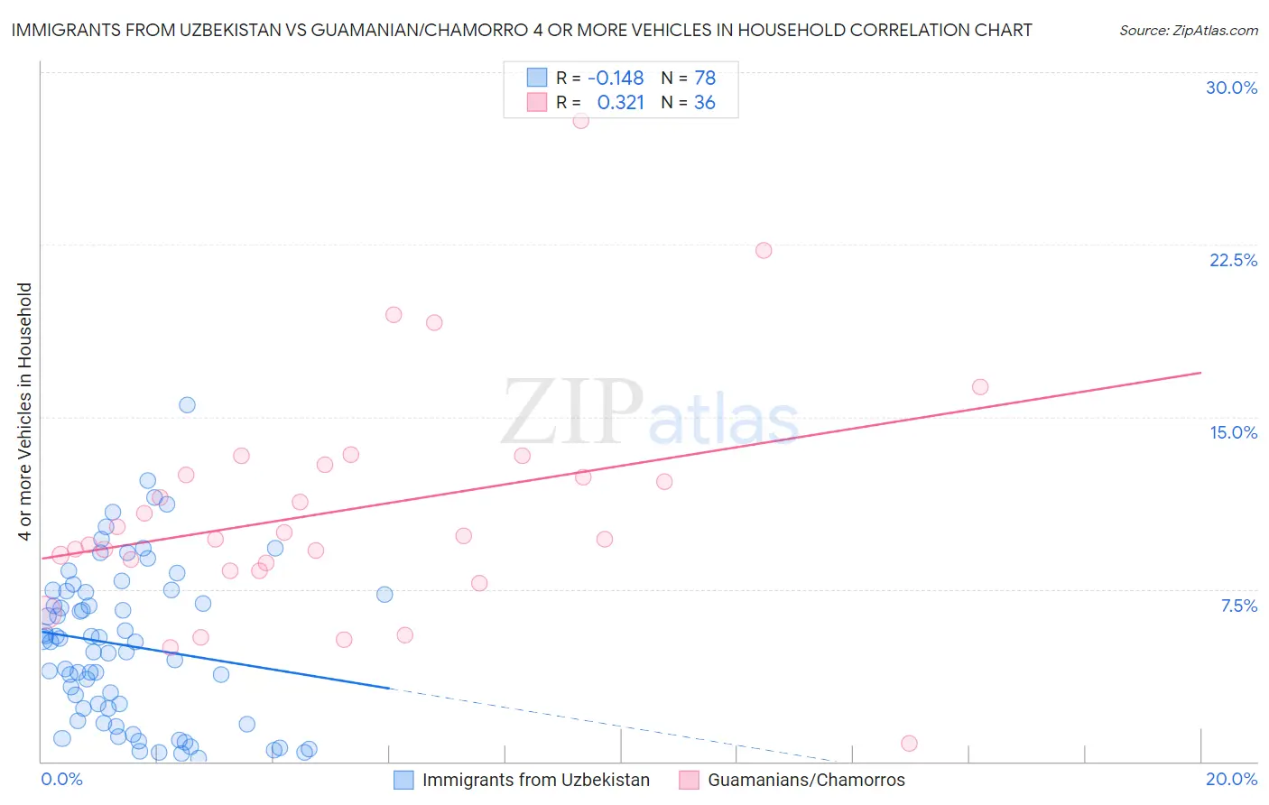 Immigrants from Uzbekistan vs Guamanian/Chamorro 4 or more Vehicles in Household Correlation Chart