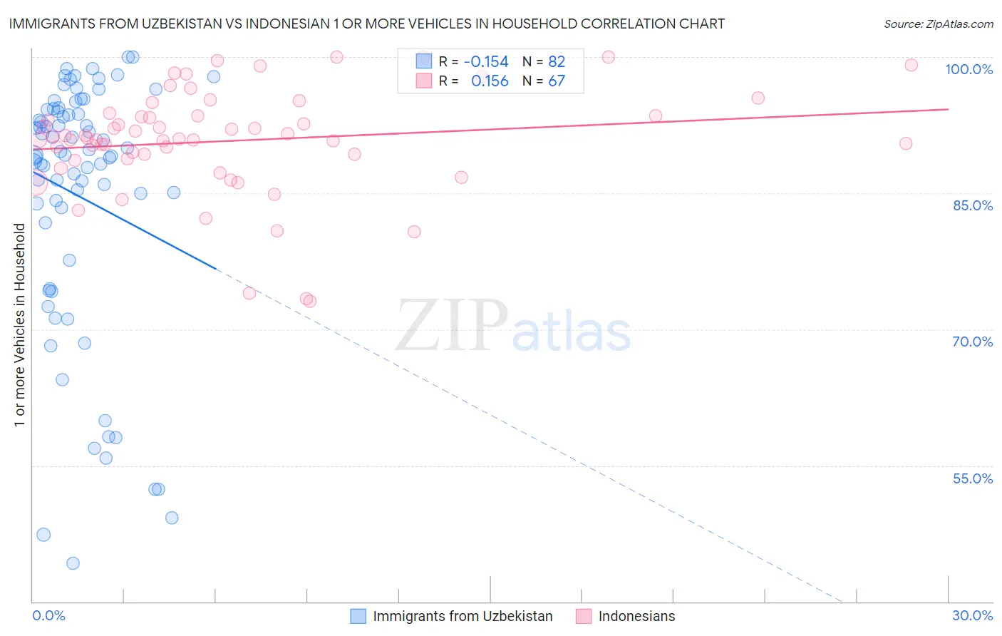 Immigrants from Uzbekistan vs Indonesian 1 or more Vehicles in Household Correlation Chart