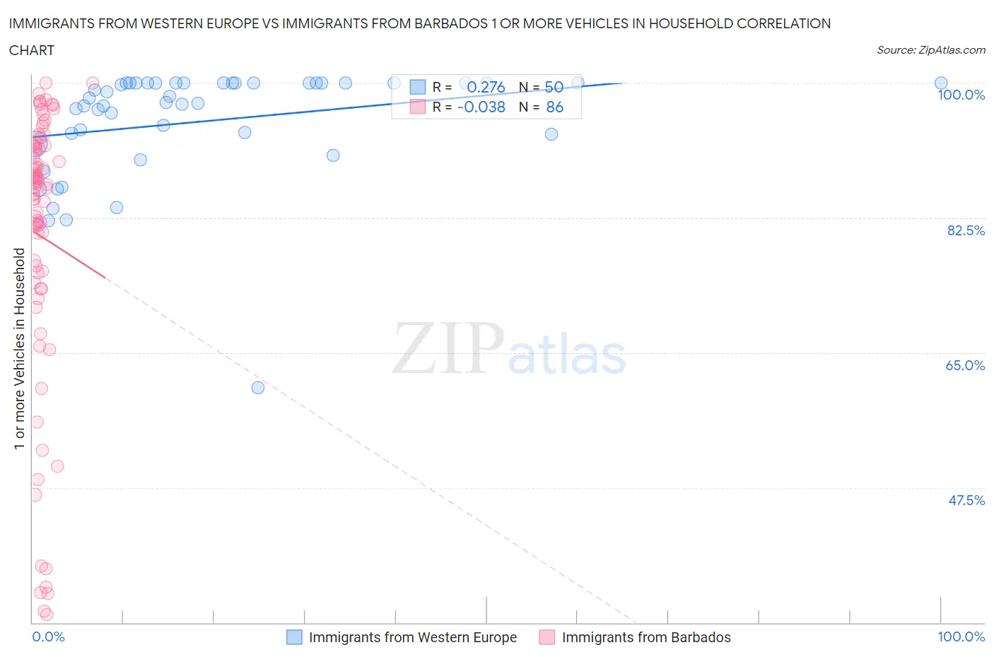 Immigrants from Western Europe vs Immigrants from Barbados 1 or more Vehicles in Household Correlation Chart