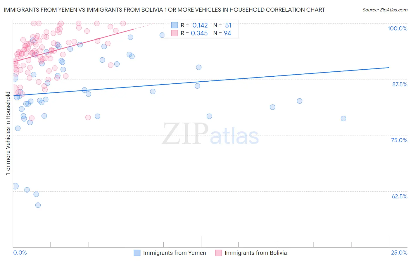 Immigrants from Yemen vs Immigrants from Bolivia 1 or more Vehicles in Household Correlation Chart