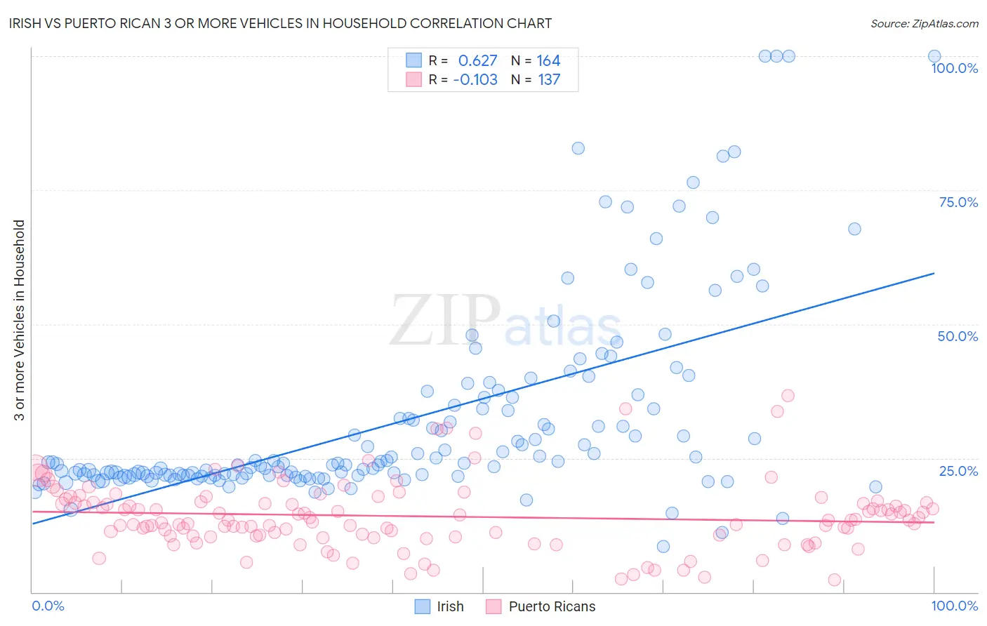 Irish vs Puerto Rican 3 or more Vehicles in Household Correlation Chart