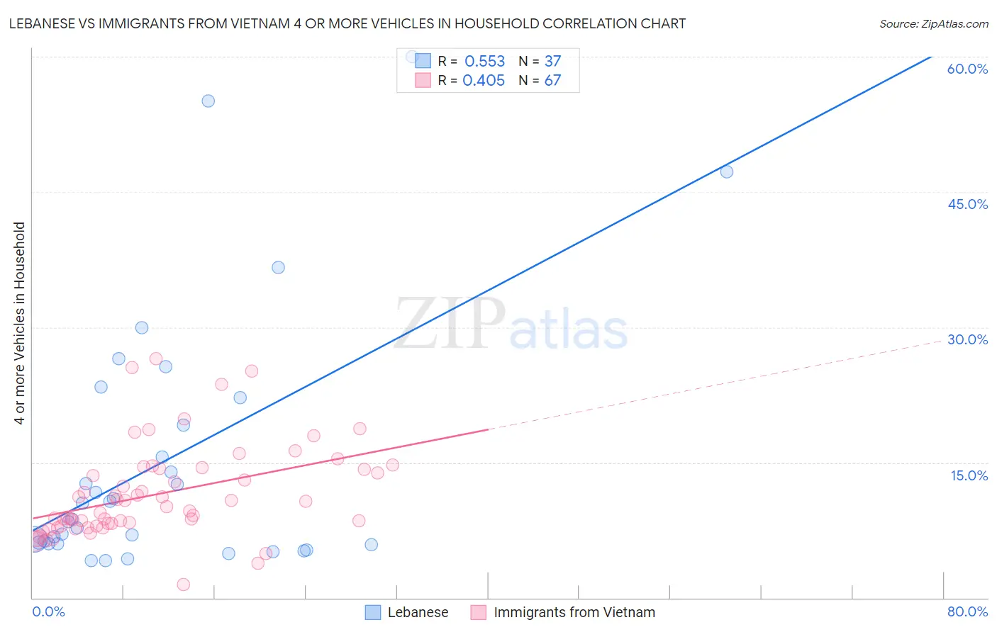 Lebanese vs Immigrants from Vietnam 4 or more Vehicles in Household Correlation Chart