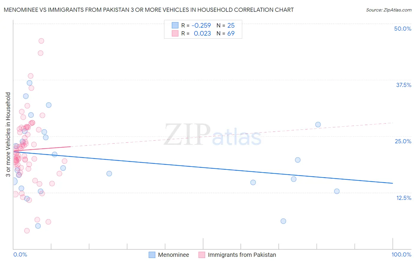 Menominee vs Immigrants from Pakistan 3 or more Vehicles in Household Correlation Chart