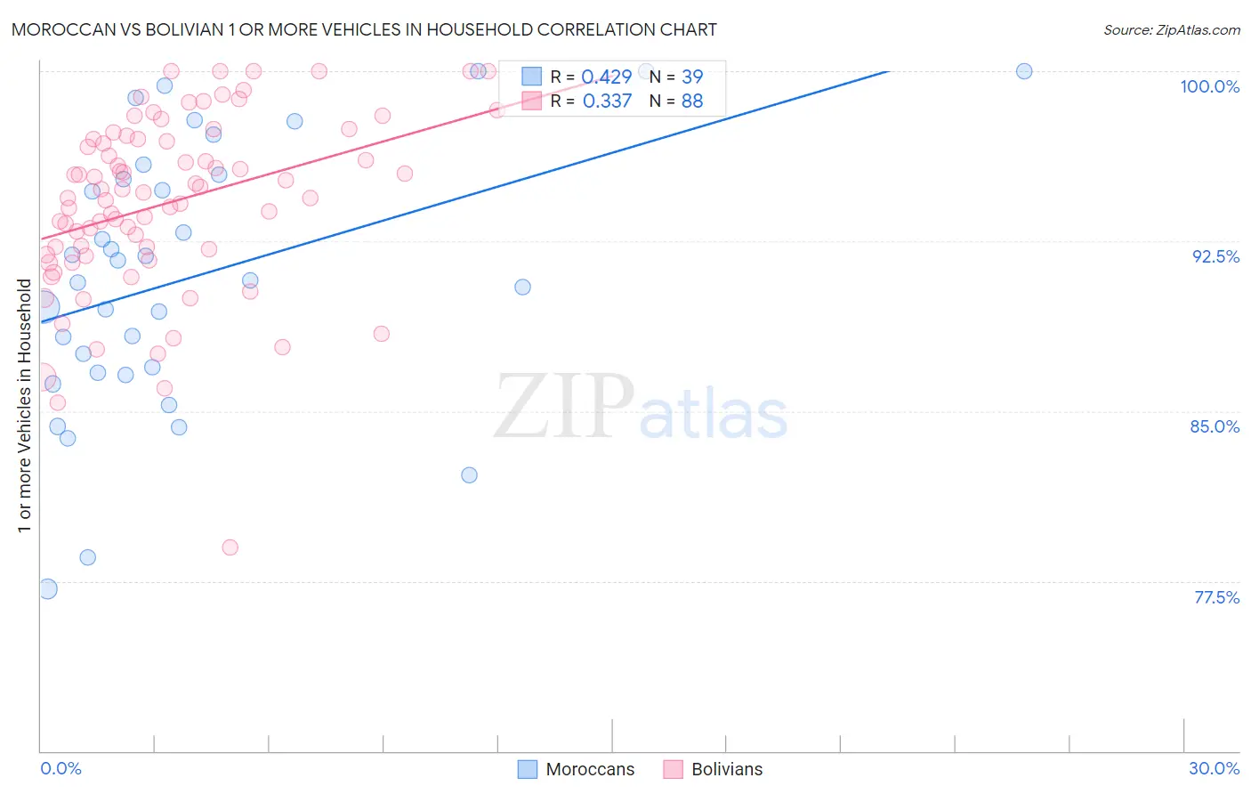 Moroccan vs Bolivian 1 or more Vehicles in Household Correlation Chart