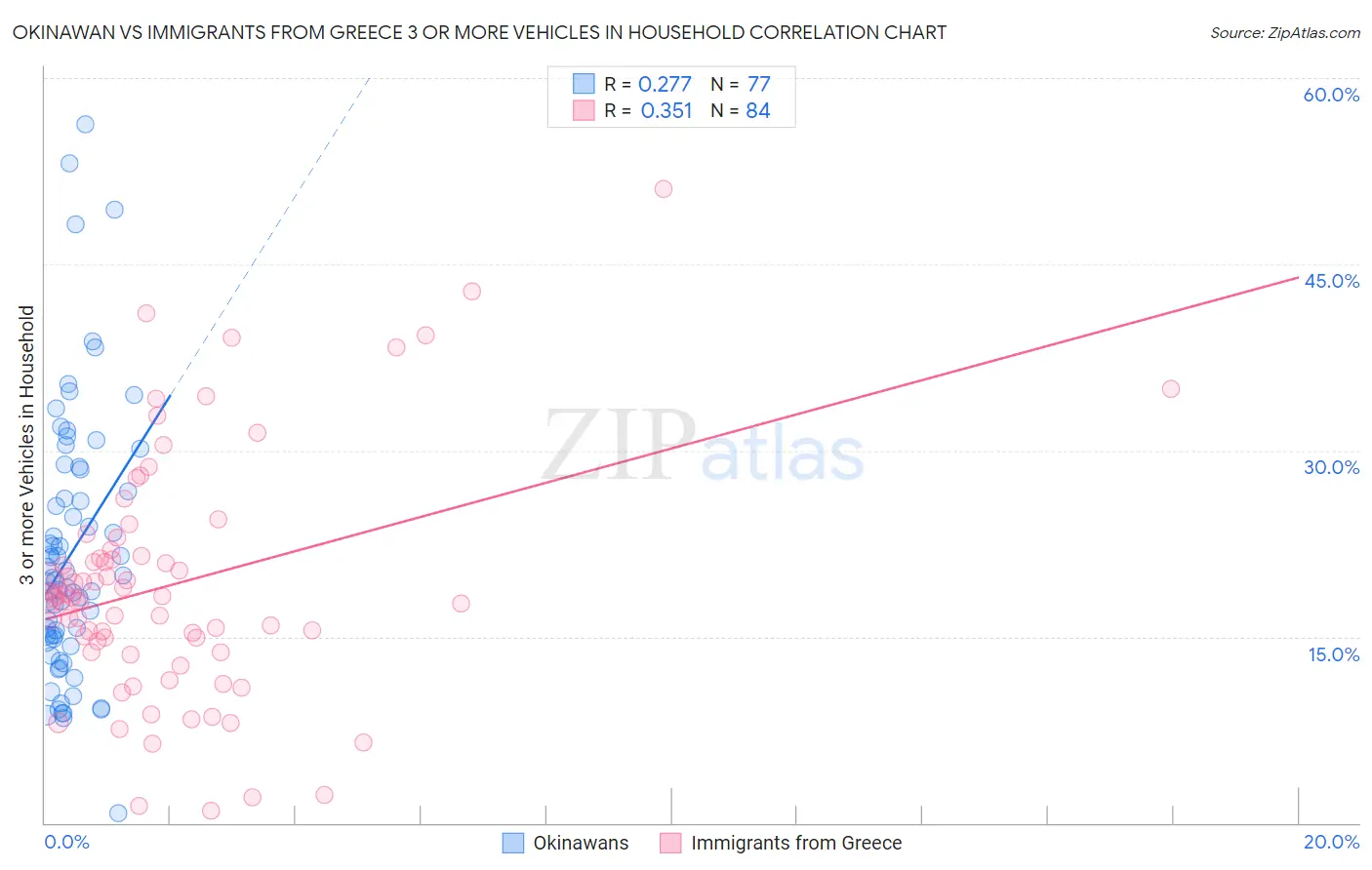 Okinawan vs Immigrants from Greece 3 or more Vehicles in Household Correlation Chart