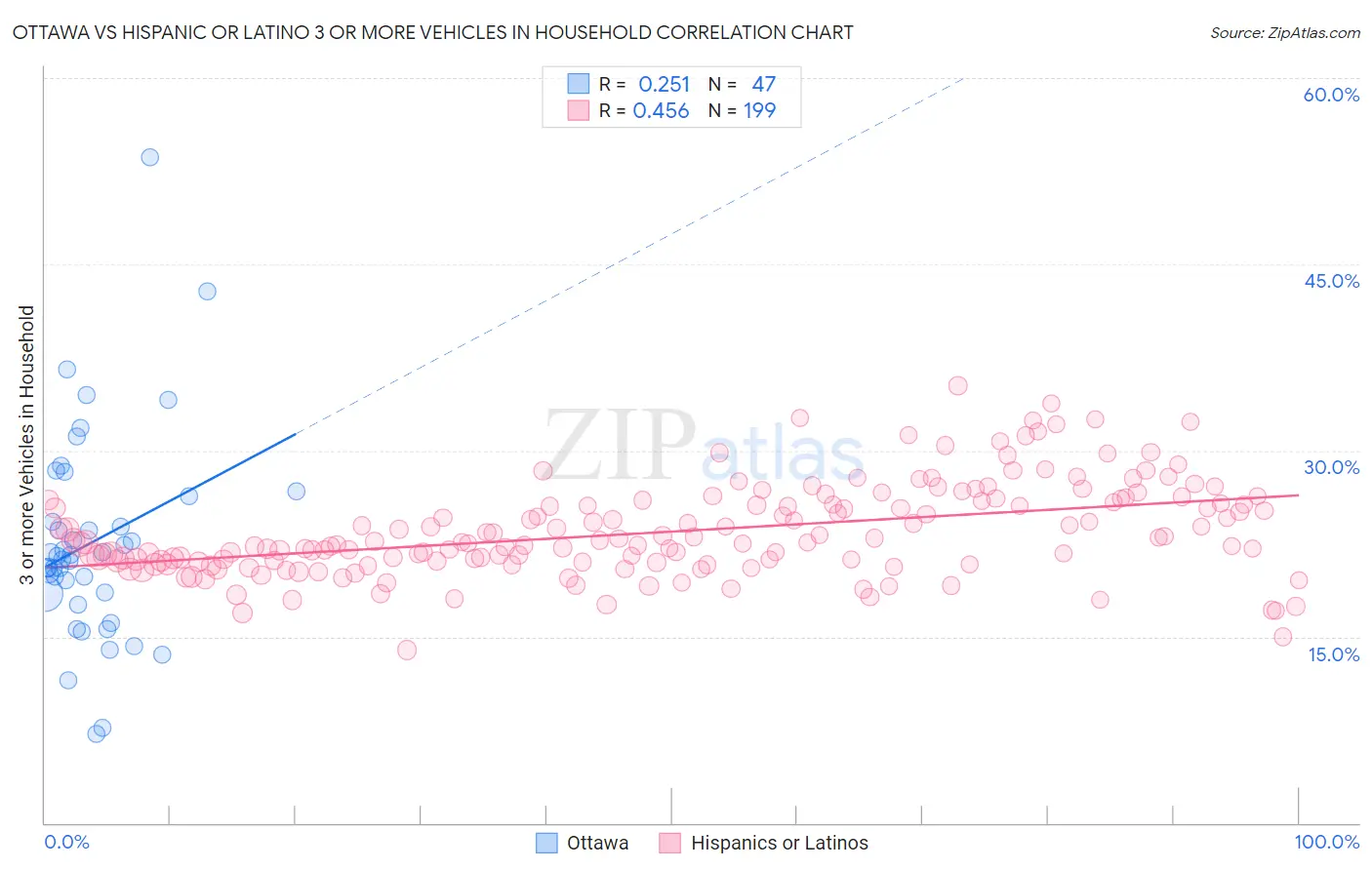 Ottawa vs Hispanic or Latino 3 or more Vehicles in Household Correlation Chart