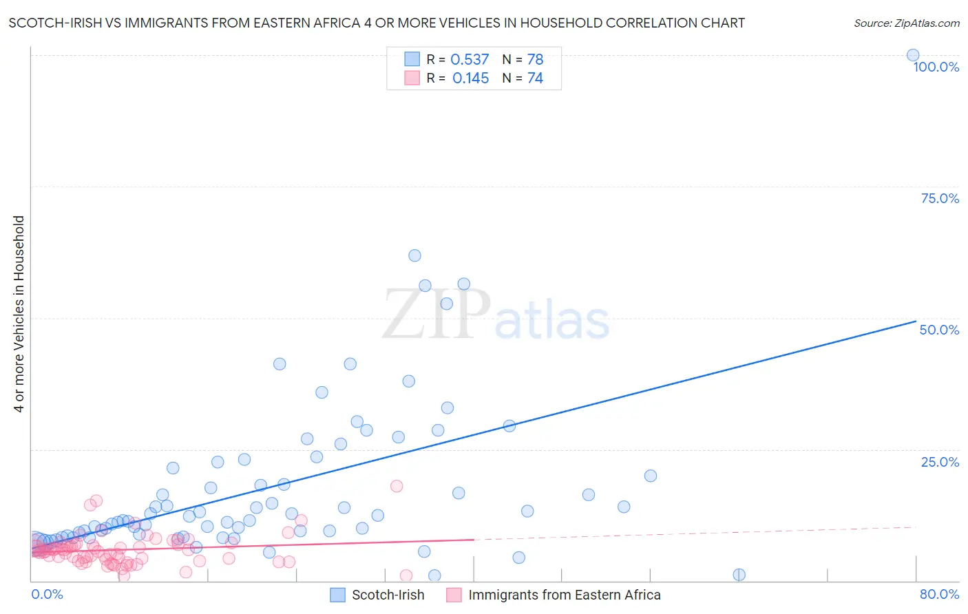 Scotch-Irish vs Immigrants from Eastern Africa 4 or more Vehicles in Household Correlation Chart