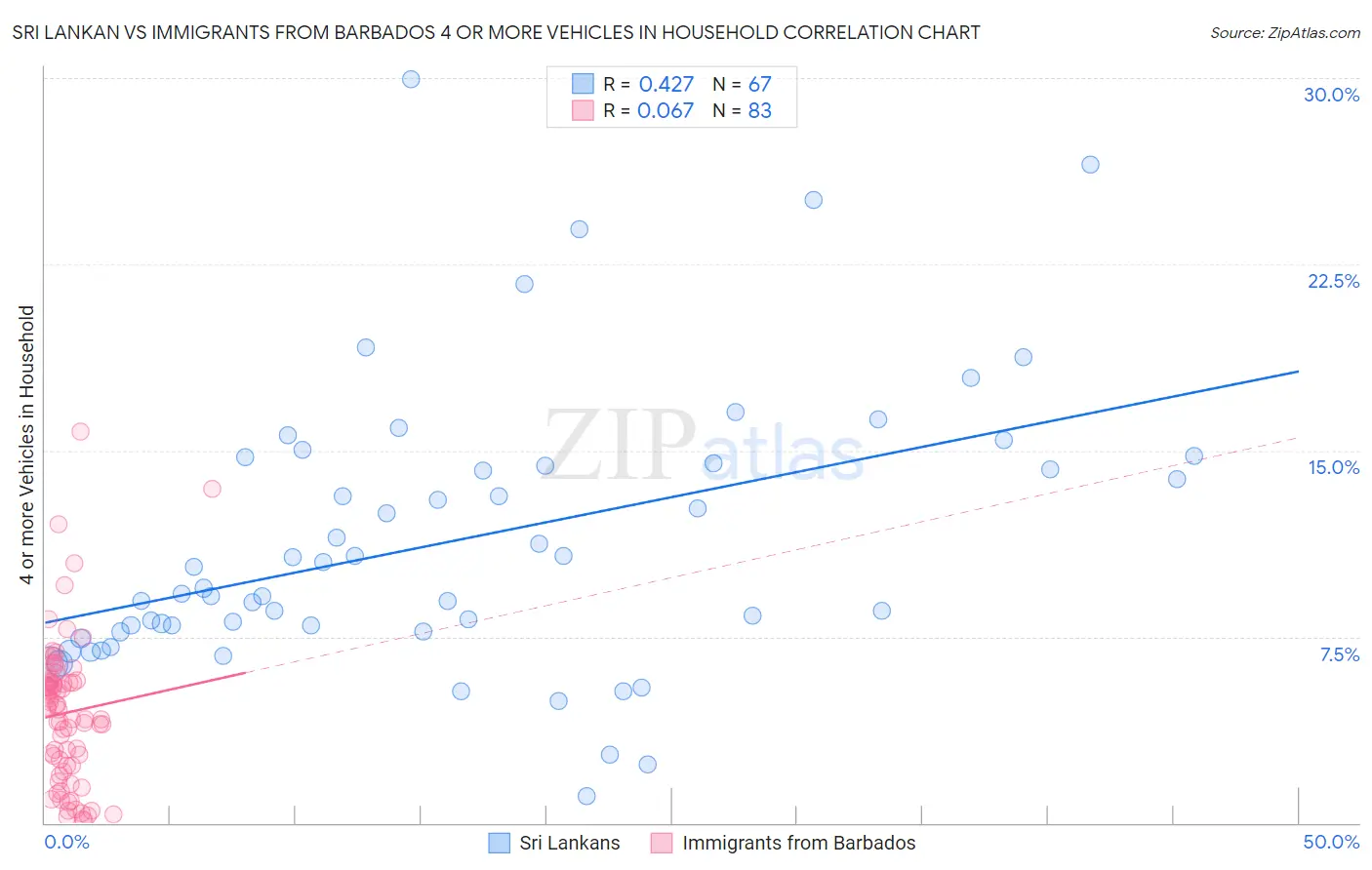 Sri Lankan vs Immigrants from Barbados 4 or more Vehicles in Household Correlation Chart