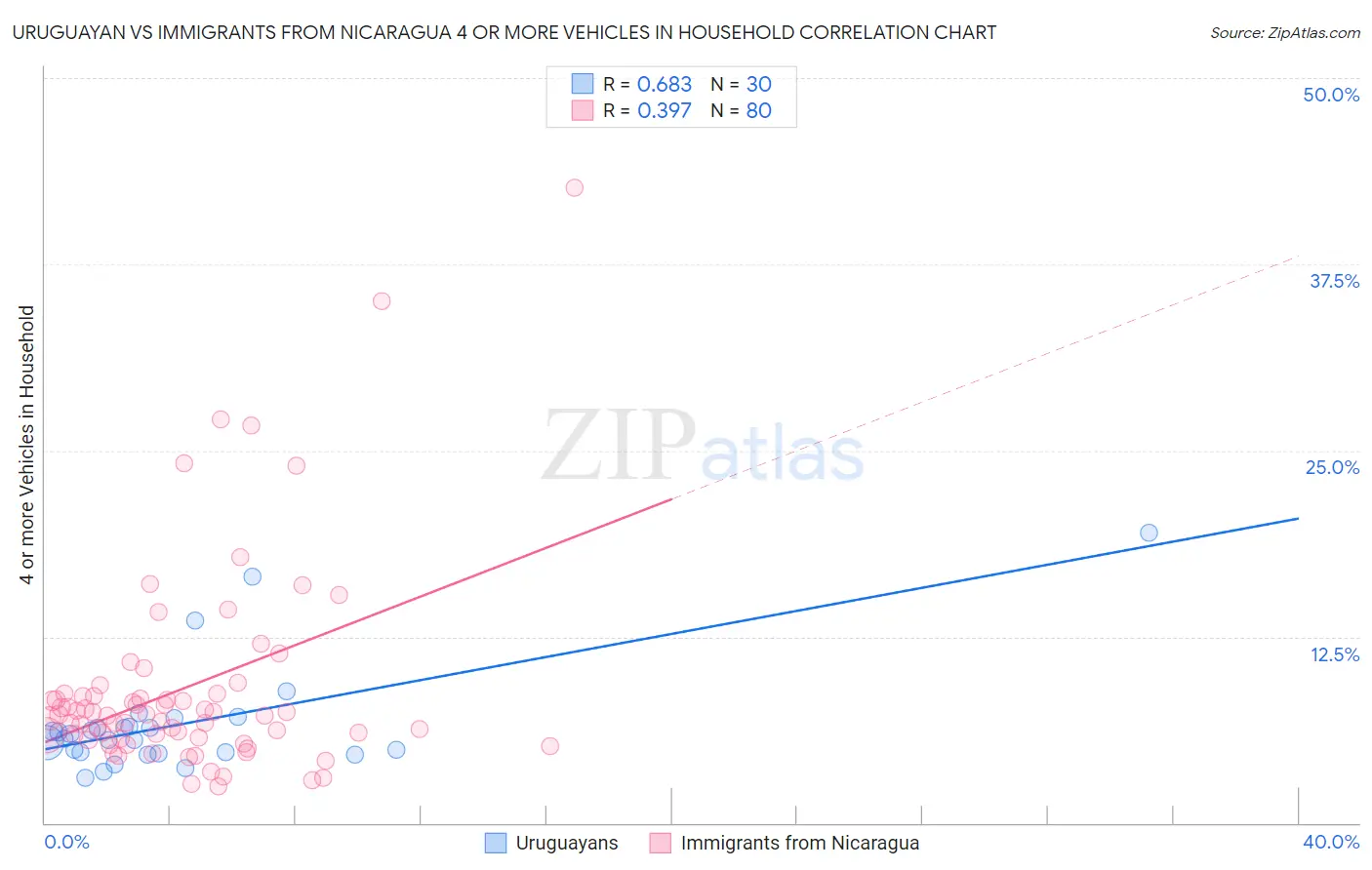 Uruguayan vs Immigrants from Nicaragua 4 or more Vehicles in Household Correlation Chart