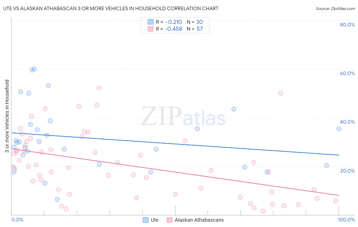 The statistical analysis conducted on geographies consisting of 55,668,268 people shows a weak negative correlation between the proportion of Ute and percentage of households with 3 or more vehicles available in the United States with a correlation coefficient (R) of -0.210 and weighted average of 22.7%. Similarly, the statistical analysis conducted on geographies consisting of 45,796,078 people shows a moderate negative correlation between the proportion of Alaskan Athabascans and percentage of households with 3 or more vehicles available in the United States with a correlation coefficient (R) of -0.458 and weighted average of 21.9%, a difference of 3.3%.