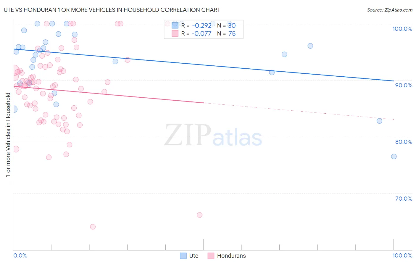 The statistical analysis conducted on geographies consisting of 55,668,072 people shows a weak negative correlation between the proportion of Ute and percentage of households with 1 or more vehicles available in the United States with a correlation coefficient (R) of -0.292 and weighted average of 88.7%. Similarly, the statistical analysis conducted on geographies consisting of 357,633,161 people shows a slight negative correlation between the proportion of Hondurans and percentage of households with 1 or more vehicles available in the United States with a correlation coefficient (R) of -0.077 and weighted average of 88.1%, a difference of 0.72%.