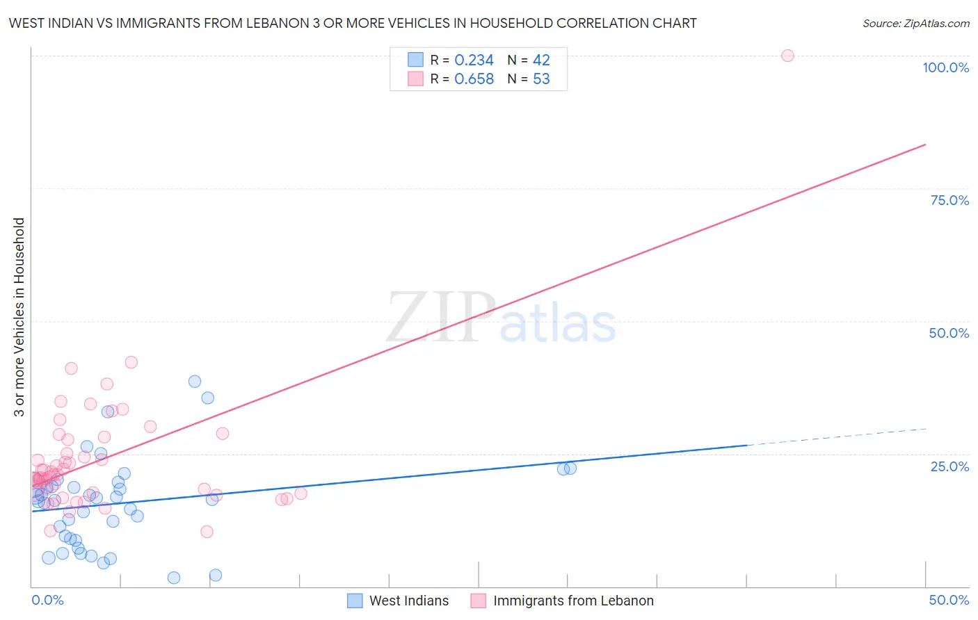 West Indian vs Immigrants from Lebanon 3 or more Vehicles in Household Correlation Chart