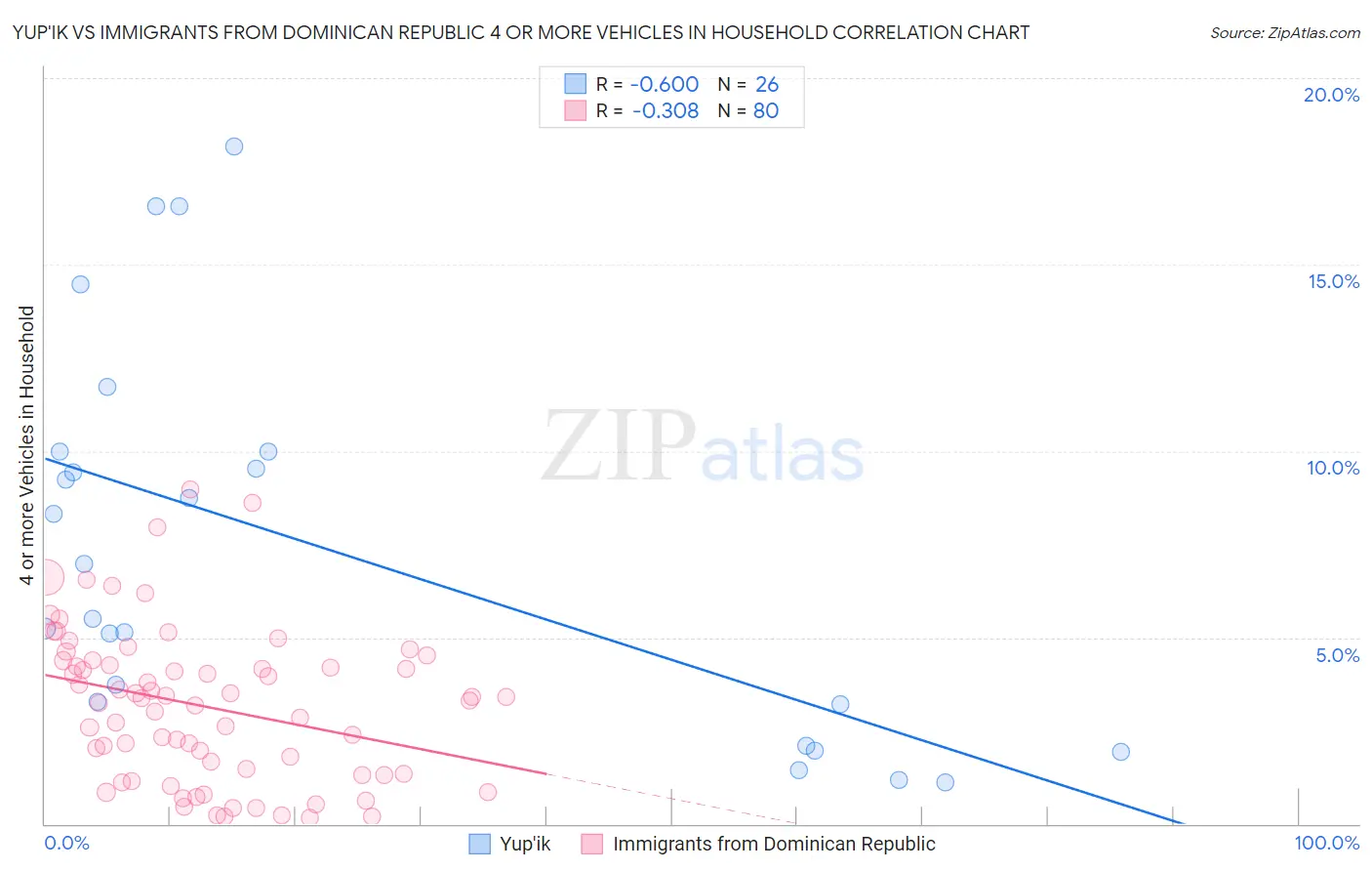 Yup'ik vs Immigrants from Dominican Republic 4 or more Vehicles in Household Correlation Chart